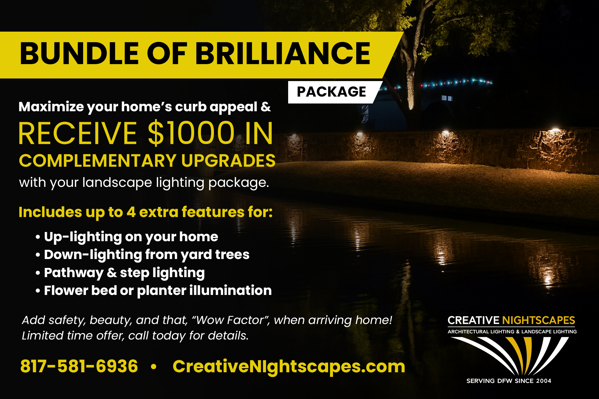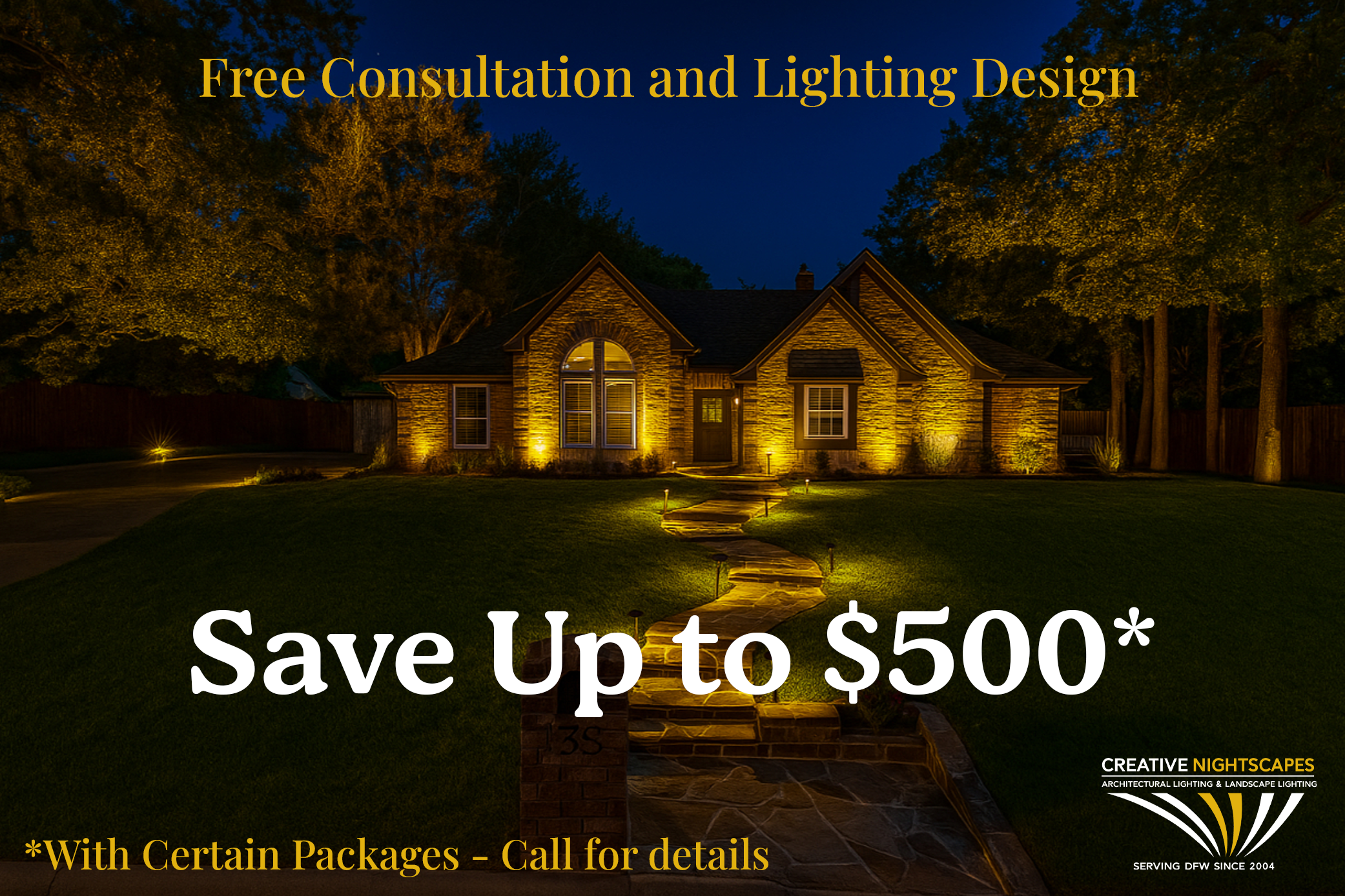 Get $500 off a new outdoor lighting installation in the Dallas–Fort Worth area with our exclusive installation coupon, or